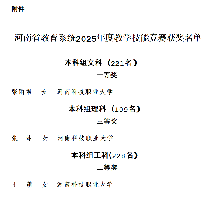 近日,河南省总工会、河南省教育厅联合印发《河南省总工会河南省教育厅关于河南省教育系统2025年度教学技能竞赛获奖情况的通报》(豫工文〔2025〕73 号),公布了全省教育系统2025年度教学技能竞赛获奖名单。我校教师张丽君荣获本科组文科一等奖;王萌荣获本科组工科二等奖;张沐荣获本科组理科三等奖。