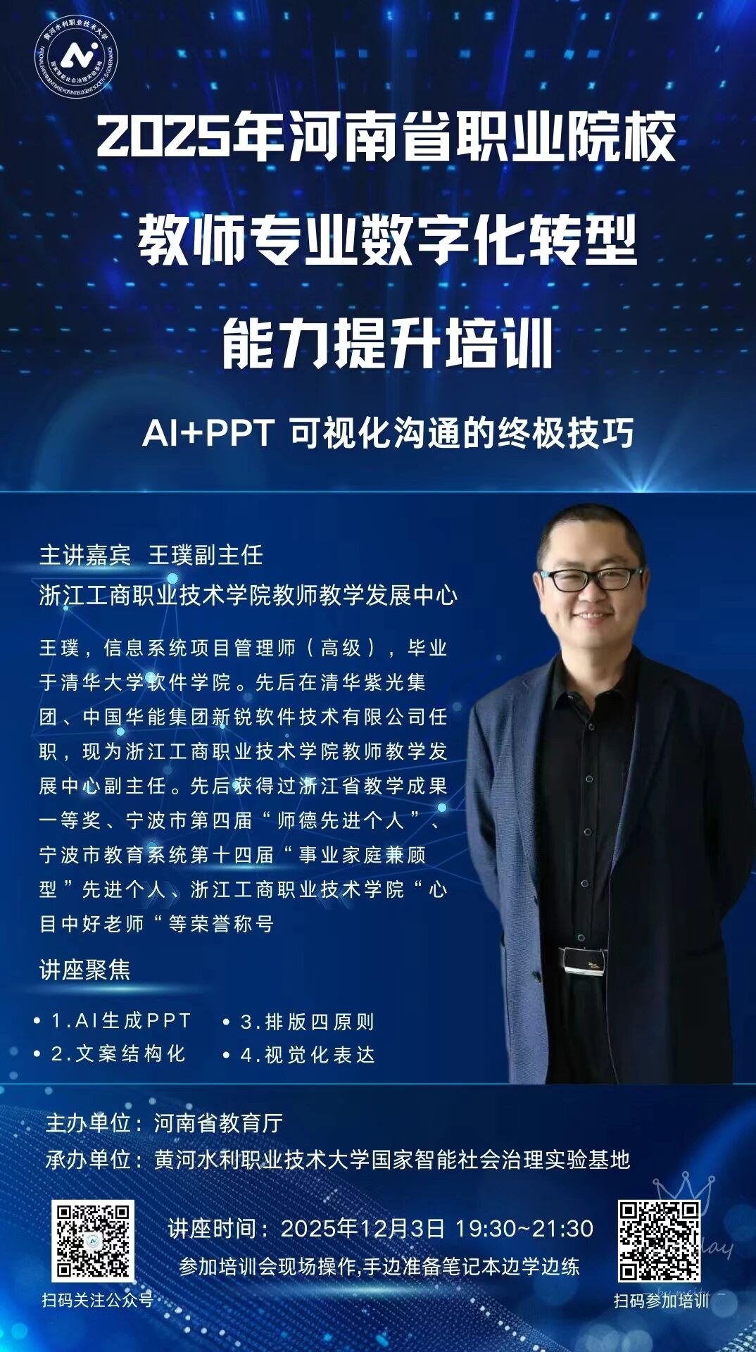 河南省教育厅主办,黄河水利职业技术大学国家智能社会治理实验基地和教务处承办的2025年河南省职业院校教师专业数字化转型能力提升线上培训活动第四期将于2025年12月3日(周三)晚上19点30分举行,本期将邀请浙江工商职业技术学院教师教学发展中心副主任王璞进行分享。