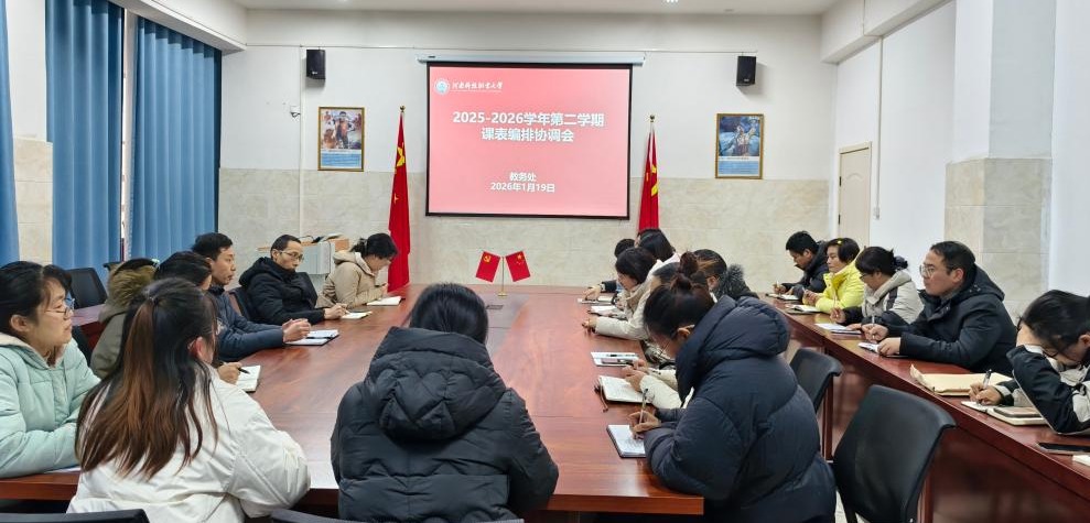 1月19日,我校在厚德楼310会议室召开2025-2026学年第二学期课表编排协调会。各学院教学副院长、教务办主任及教务处相关工作人员参加会议,教务处处长陈少军主持会议。