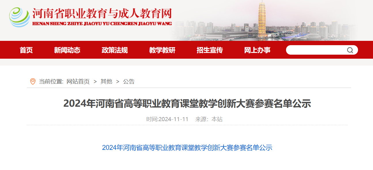 按照《河南省教育厅办公室关于开展2024年河南省高等职业教育教学竞赛活动的通知》(教办职成〔2024〕119号)要求,经学校申报、资格审核,2024年河南省高等职业教育课堂教学创新大赛参赛名单,已在“河南省职业教育与成人教育网”进行公示